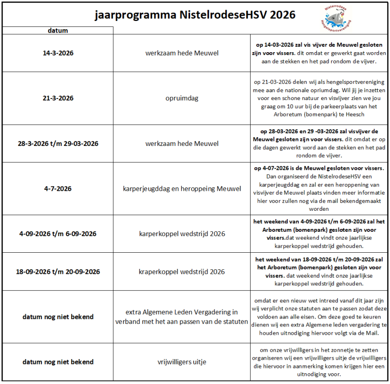 Hierbij nodigen wij u uit voor het bijwonen van de algemene ledenvergadering van de Nistelrodese Hengelsportvereniging.